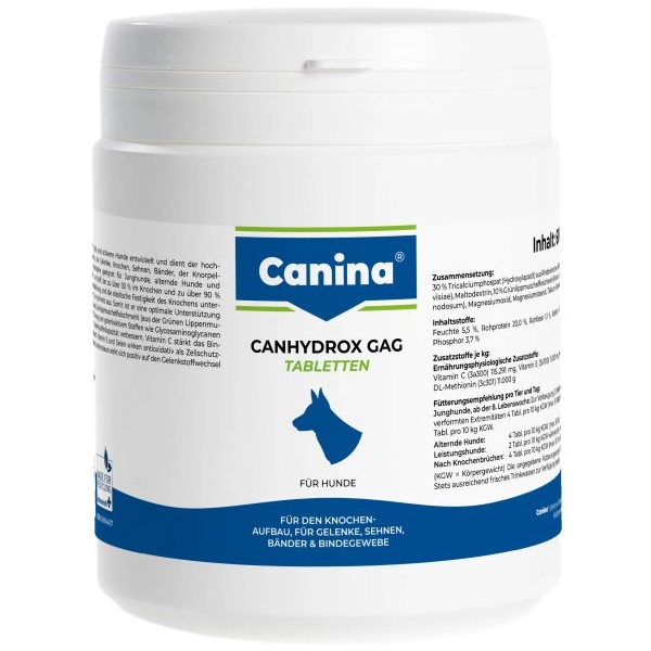 Canina Canhydrox GAG posilňuje väzy, šľachy a svaly, napomáha rastu silnej kostry, zabraňuje dyspláziu bedrového kĺbu, podporuje vývoj silného chrupu, pevných ďasien, vytvrdnutí zubnej skloviny.