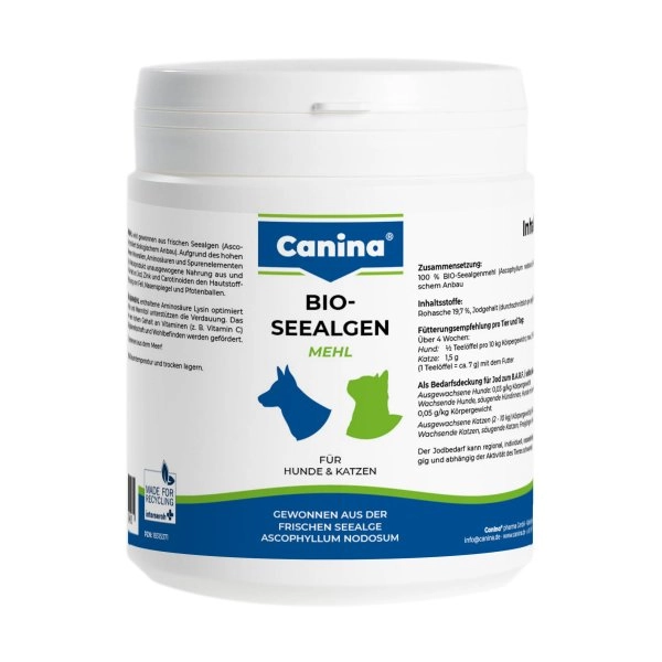 canina Morská riasa vo forme prášku. Čisto prírodný produkt pre psov aj mačky získavaný šetrným sušením morských rias druhu Ascophyllum nodosum, obsahujúce karotenoidy, množstvo aminokyselín, vitamínov a stopových prvkov.