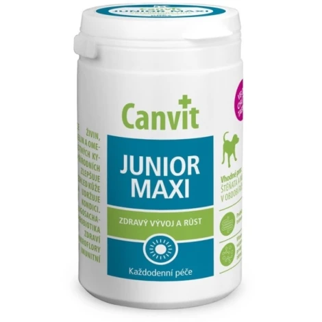 Canvit Junior Maxi je preventívna podpora vývoja a rastu šteniat a mladých psov veľkých plemien. Tablety sú zdrojom aminokyselín, vitamínov, omega-3 a omega-6 nenasýtených mastných kyselín, prebiotík aj probiotík.