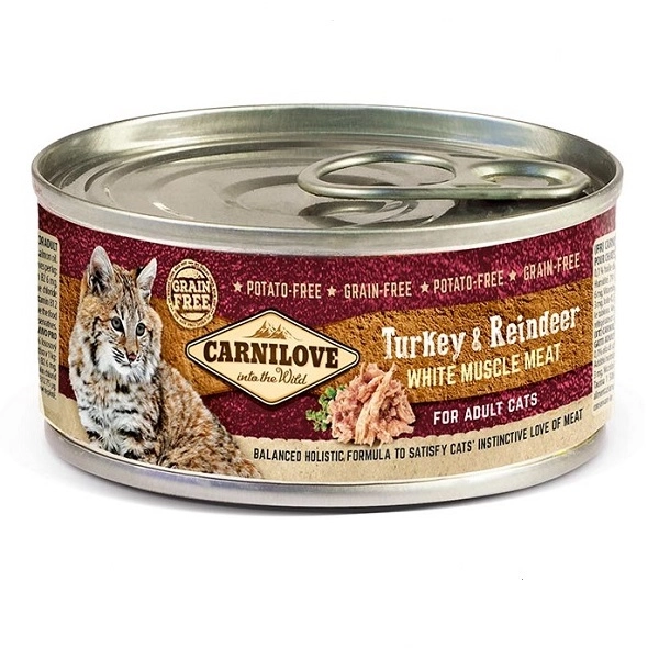 Carnilove konzerva pre dospelé mačky je plná mäsa z moriaka a soba. Poskytuje kompletnú výživu v tej najčistejšej podobe. Úplne bez obilnín, zemiakov a sóje. Doplnené brusnicami pre zdravý močový trakt.