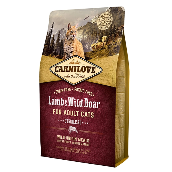 Špičkové bezobilné krmivo CARNILOVE s extra vysokým obsahom mäsa z jahniat a kancov. Tapioka, hrášok, mrkva, jablká a ďalšie lahodné suroviny poskytujú vašej mačke čistú energiu. Lahodná plná chuť, ktorá prináša perfektnú výživu. Určené kastrovaným mačkám.