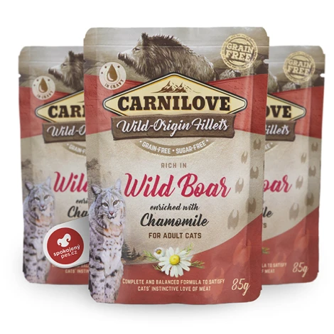Kompletné krmivo pre mačky vo forme kapsičky s vysokým obsahom mäsa - 85%. Kapsičku s kúskami mäsa z diviaka a púpavou si vaša mačka zamiluje! Bez obilnín, zemiakov, GMO, sóje, cukru a konzervantov.