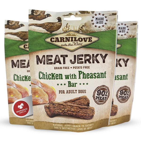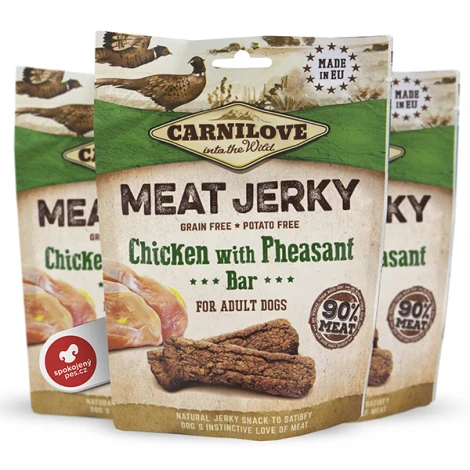 Bez obilnín, farbív, cukru a GMO - to sú maškrty Carnilove Jerky! Mäsové tyčinky s 90 % obsahom ozajstného kurčaťa a bažanta. Váš pes ich bude milovať!