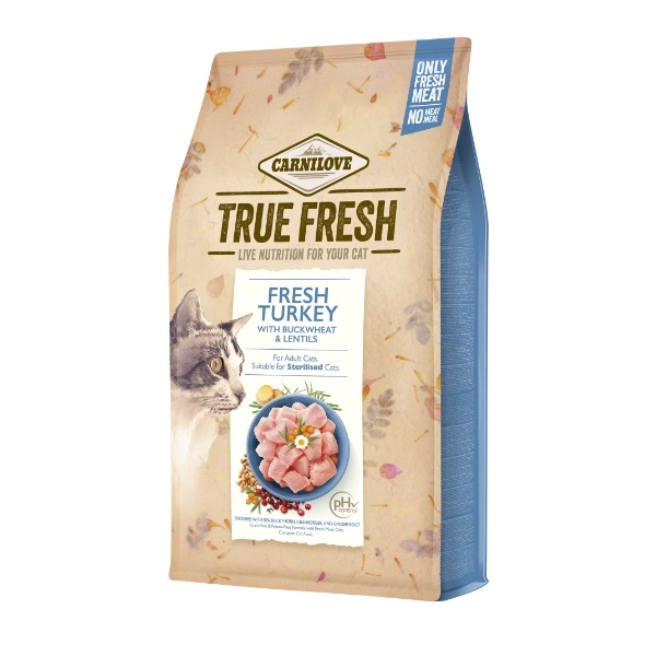 Carnilove True Fresh Cat Turkey sa vyrába bez použitia múčky. Zloženie obsahuje vysoký podiel čerstvého morčacieho mäsa od farmárskych, lokálnych dodávateľov. Toto je kompletné suché krmivo pre dospelé a kastrované mačky, ktoré neobsahuje obilniny ani zemiaky. Okrem toho je zloženie obohatené o rakytník, brusnice a koreň zázvoru. Jedinečná výrobná metóda zachováva pôvodné vlastnosti zložiek a prináša úplne nový a výnimočný zmyslový zážitok, ktorý uspokojuje prirodzené inštinkty mačiek.