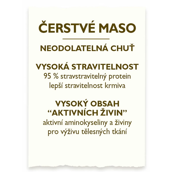 Čerstvé morčacie mäso (70 %), hrachová bielkovina, červená šošovica, pohánka (4 %), prírodné arómy, kurací tuk, lososový olej (1 %), chlorid sodný, chlorid draselný, sušené riasy (Ascophyllum nodosum, 0,5 %), bielkovina ostrieža (Lemna) (0,5 %), hrachová múka, sušený rakytník (0,2 %), 1 %), pivovarské kvasnice (zdroj manán-oligosacharidov, 0,015 %), koreň čakanky (zdroj frukto-oligosacharidov, 0,015 %), yucca schidigera (0,008 %).