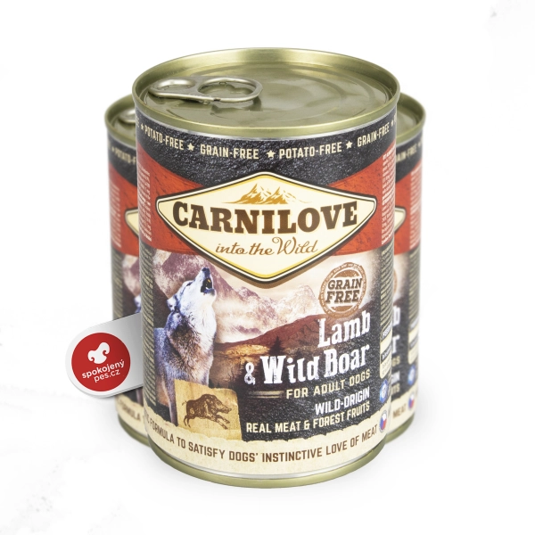 Mäsová konzerva Carnilove pre dospelých psov s príchuťou jahňacieho a diviačieho mäsa. Žiadne obilniny, zemiaky ani sója.
