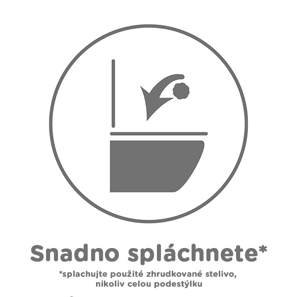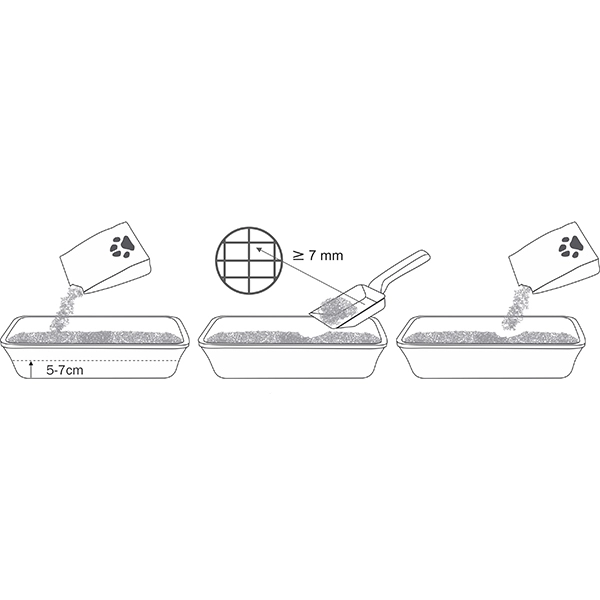 Do čistej mačacej toalety nasypte vrstvu podstielky vysokú cca 5 cm. Potom, čo mačka vykoná potrebu, vznikne v podstielke hrudka – tú vyberte lopatkou a nahraďte rovnakým množstvom čistej podstielky. Raz za čas vyhoďte stelivo kompletne a toaletu pred ďalším použitím dôkladne vyčistite.