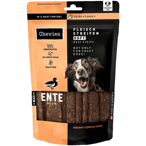Chewies Fleischstreifen Soft Maxi sú šťavnaté na vzduchu sušené plátky kačacieho mäsa, ktoré uspokoja aj tie najnáročnejšie psie chute. Vďaka šetrnému sušeniu si mäso zachováva prirodzenú chuť a živiny, zostáva krásne mäkké a dá sa ľahko rozlomiť na menšie kúsky. Okrem toho obsahuje extra dávku vitamínu C na podporu imunitného systému. Pochúťky sú ideálne pre šteňatá, dospelých psov a seniorov - skrátka pre každého, kto si zaslúži poriadnu mäsovú odmenu.