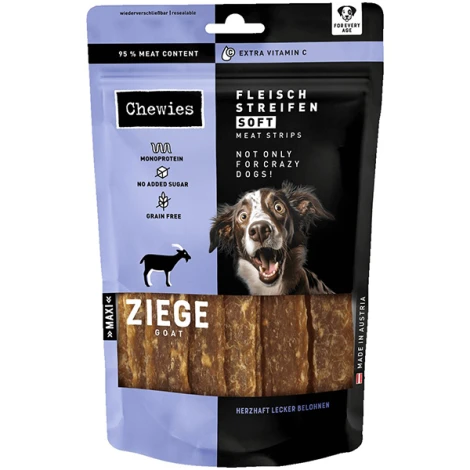 Na vzduchu sušené plátky mäkkého kozieho mäsa Chewies Fleischstreifen Soft Maxi si vychutnajú chlpáčikovia všetkých vekových kategórií - od hravých šteniatok až po seniorov. Táto prírodná jednobielkovinová pochúťka s extra dávkou vitamínu C poteší aj psov s potravinovými alergiami.