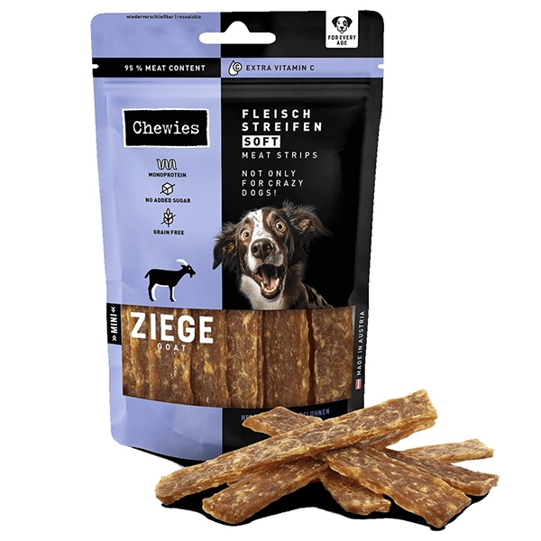 Na vzduchu sušené plátky mäkkého kozieho mäsa Chewies Fleischstreifen Soft Mini si vychutnajú chlpáčikovia všetkých vekových kategórií - od hravých šteniatok až po starších ľudí. Táto prírodná jednobielkovinová pochúťka s extra dávkou vitamínu C poteší aj psov s potravinovými alergiami.