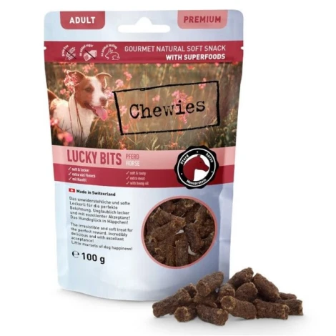 Chewies Lucky Bits sú pochúťky s extra vysokým obsahom konského mäsa, ktoré slúžia ako skvelá odmena a zdravá desiata nielen počas tréningu. Vďaka konopnému oleju, ktorý je mimoriadne bohatý na nenasýtené mastné kyseliny a vitamín E, priaznivo pôsobí na kožu, srsť, tráviaci a imunitný systém a je vhodný aj pre alergikov. Neobsahujú žiadne obilniny ani pridaný cukor a vyrábajú sa za najprísnejších podmienok vo Švajčiarsku.