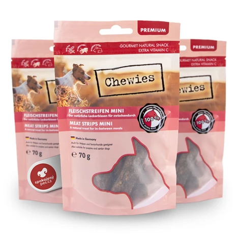 100% prírodná mäsová pochúťka pre psov Chewies Mini s vitamínom C. Vďaka šetrnému spracovaniu si zachováva všetky dôležiťé živiny, vitamíny a minerály. Bez obsahu cukrov, konzervantov, umelých farbív a dochucovadiel. Vyrobené v Nemecku.