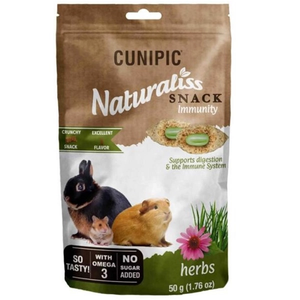 Lahodná maškrta Cunipic Naturaliss Immunity sa stane rýchlo obľúbencom snáď každého chlpáča. Jedná sa totiž o netradičnú maškrtu, ktorá je na povrchu chrumkavá, ale zároveň je vo vnútri naplnená jemným krémom z bylinkového extraktu. Tieto plnené vankúšiky obsahujú mnoho vitamínov, vlákniny a antioxidantov.