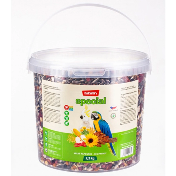 Darwin's Special Large Parrot je kompletné krmivo pre veľké papagáje so zvýšeným obsahom vitamínov. Obsahuje zložky bohaté na kvalitné tuky, vápnik a Yucca schidigera, ktorá znižuje nepríjemný zápach z exkrementov.