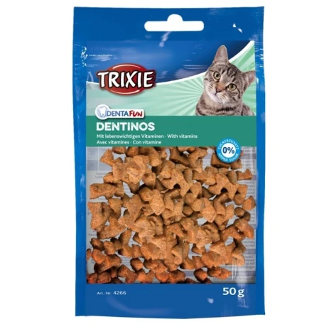 Pochúťka Denta Fun Dentinos - vitamíny pre mačku. Špeciálny tvar pochúťky napomáha čisteniu zubov a masíruje ďasná - prevencia proti zubnému povlaku aj kameni. Pochúťka je bohatá na vitamíny, bez pridaných cukrov.