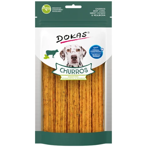 Chutné žuvacie pochúťky Dokas v tvare churros sú vyrobené z hovädzej kože, ktorá je obalená vrstvou hovädzej pečene, múčnych červov a sladkých zemiakov. Váš pes si ich zamiluje nielen pre ich výraznú chuť a vôňu, ale aj pre mimoriadny zážitok zo žuvania, ktorý mu poskytne ich zvlnený tvar. Ten zároveň pomáha udržiavať zdravé zuby a ďasná.