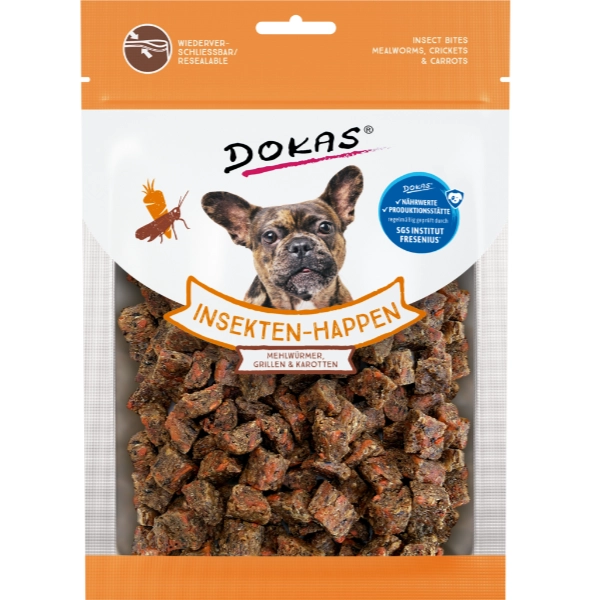 Lahodné maškrty Dokas s vysoko kvalitným zdrojom proteínu. Jedinečná receptúra s obsahom sušených cvrčkov, múčnych červov a mrkvy. Ľahko stráviteľná odmena vhodná pre psíkov s citlivým zažívaním.