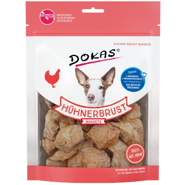 Nugety z kuracích pŕs sušené mrazom vynikajú intenzívnou chuťou a maximálnym zachovaním živín vďaka šetrnému spracovaniu. Záruka skvelého maškrtenie aj pre tých najnáročnejších. Vysoká kvalita použitých surovín zaručuje výraznú chuť a vôňu. Sú veľmi obľúbené pre svoje prírodné zloženie . Maškrty Dokas sú b ez konzervantov, umelých farbív, dochucovadiel a glycerínu . Vrecko má praktické uzatváranie, maškrty tak zostanú dlhšie čerstvé a voňavé.