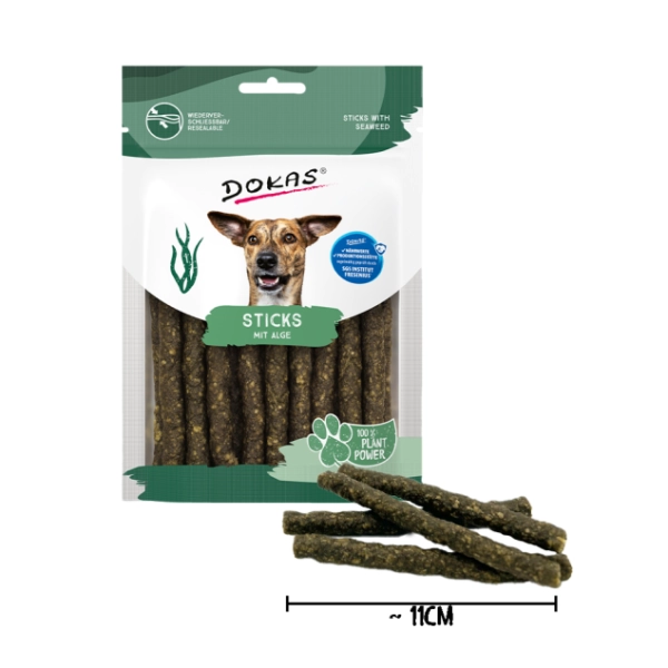 Polomäkké tyčinky Dokas s morskými riasami a spirulinou sú vyrobené len z rastlinných bielkovinových extraktov, ovocia a morských rias. Túto 100 % prírodnú bezmäsitú pochúťku môžete svojmu chlpatému priateľovi podávať vcelku ako mäkkú žuvaciu pochúťku alebo ju môžete rozlomiť na menšie kúsky a použiť počas tréningu. Vďaka morským riasam a spiruline sú bohaté na minerály, vitamíny a antioxidanty, ktoré podporujú zdravé trávenie, posilňujú imunitný systém a zlepšujú kvalitu srsti a kože.
