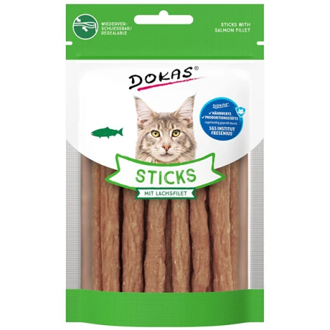 Tyčinky Dokas s vysokým podielom lososových filetov si zamiluje každá mačka. Vďaka ich mäkkej konzistencii si s nimi poradia mačky všetkých vekových kategórií, či už ich ponúknete celé, alebo ich rozlomíte na menšie kúsky. Tyčinky obsahujú aj kuracie chrupavky, ktoré sú prirodzeným zdrojom kolagénu. Ten pomáha udržiavať kĺby pružné a zdravé, čo ocenia najmä aktívne, väčšie alebo staršie mačky.