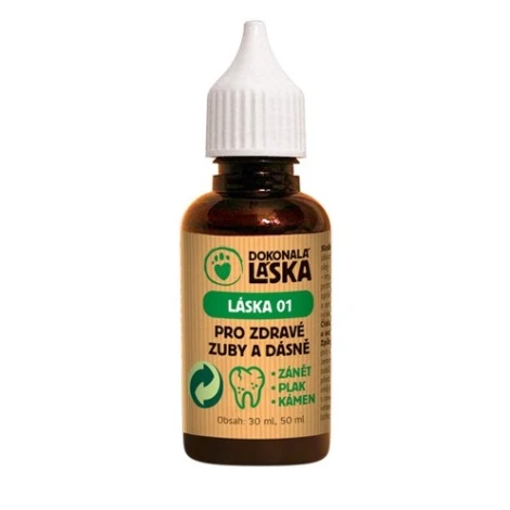 Dokonalá láska 01 je prírodná podporná starostlivosť o ďasná a zuby psov. Pôsobí protizápalovo a podporuje hojenie ďasien. Vďaka účinným látkam a spôsobu aplikácie dochádza k správnemu prekrvovanie. Prípravok pôsobí fytoncídne a antisepticky, obmedzuje rast baktérií. a zamedzuje tvorbe zubného plaku.