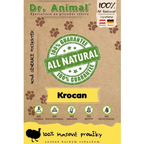 100% prírodná mäsové pochúťky Dr. Animal pre psov. Chrumkavé plátky z morčacieho mäsa sú veľmi chutné, nízkokalorické a dobre stráviteľné. Ide o produkt 4A, čo znamená: narodený, chovaný, porazený a spracovaný v Rakúsku.