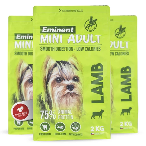 Eminent Dog Adult Mini Lamb je nízko kalorické krmivo vhodné pre dospelé psy toy a mini plemien, ktoré sú náchylné k zažívacím problémom.