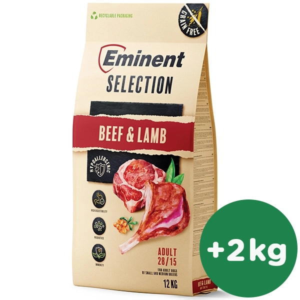 Eminent Dog Selection Adult Beef & Lamb je superprémiové krmivo bez obilnín pre dospelé psy malých a stredných plemien. Kombinuje hovädzie a jahňacie mäso bohaté na esenciálne aminokyseliny s ľahko stráviteľnými zložkami a funkčnými bylinami, ktoré podporujú imunitu a zdravie psa. Vďaka starostlivo vyváženému zloženiu krmivo udržiava optimálnu kondíciu, vitalitu a lesklú srsť, čo z neho robí ideálnu voľbu pre psov s citlivým trávením.