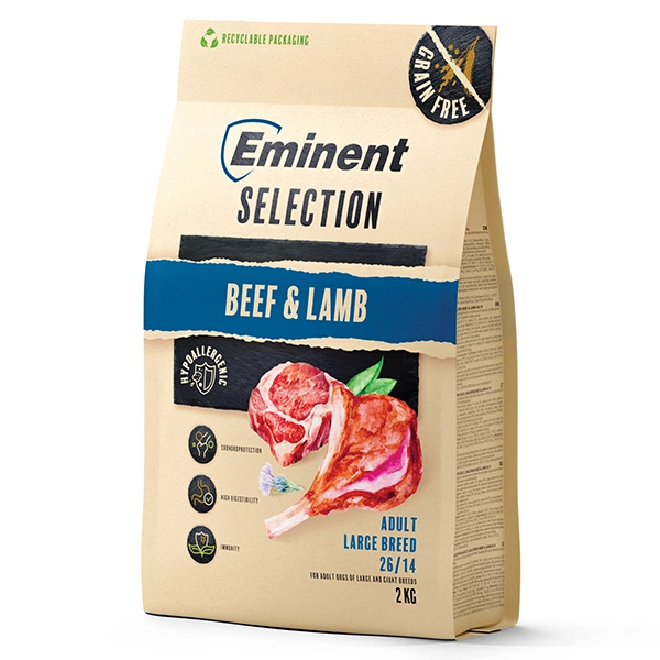 Eminent Dog Selection Adult Large Breed Beef & Lamb je superprémiové krmivo bez obilnín pre dospelých psov veľkých a obrích plemien. Kombinuje vysokokvalitné bielkoviny z hovädzieho a jahňacieho mäsa s ľahko stráviteľnými zložkami a funkčnými bylinkami na podporu imunity a zdravia vášho psa. Granule majú špeciálnu veľkosť a tvar, aby sa minimalizovalo žuvanie a riziko tráviacich problémov, ako je nadúvanie a torzia žalúdka.