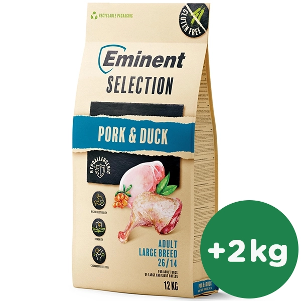 Bezlepkové superprémiové krmivo Eminent Dog Selection Adult Large Breed Pork & Duck je určené pre dospelých psov veľkých a obrích plemien. Podporuje zdravé kĺby, svaly a vitalitu, dodáva energiu pre aktívny život a je šetrné k citlivému tráveniu.
