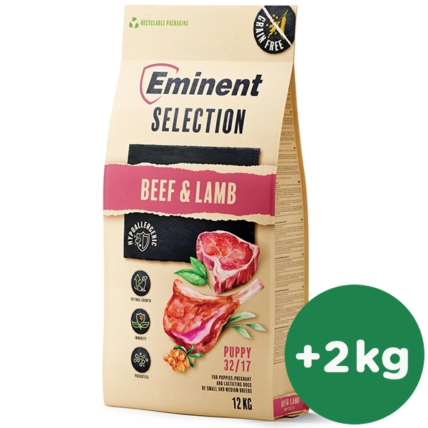 Eminent Dog Selection Puppy Beef & Lamb je superprémiové krmivo bez obilnín vhodné pre šteňatá, ako aj pre gravidné a dojčiace psy malých a stredných plemien. Kombinuje vysokokvalitné bielkoviny z hovädzieho a jahňacieho mäsa s funkčnými bylinkami a vitamínmi na podporu zdravého vývoja a silnej imunity. Vďaka starostlivo vyváženému zloženiu poskytuje vášmu štvornohému parťákovi všetko, čo potrebuje pre zdravý a vitálny štart do života.