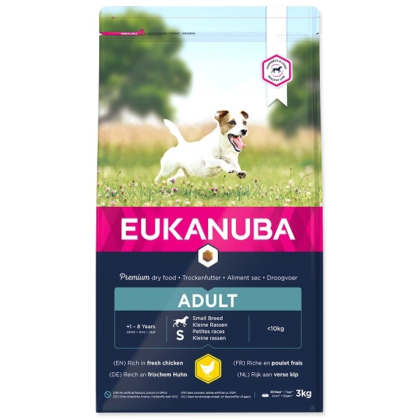 Krmivo Eukanuba Adult Small Breed pre dospelých psov malých plemien, ktorí sú priemerne aktívni a majú normálnu váhu. S menšími granulami pre ľahké hryzenie a trávenie.