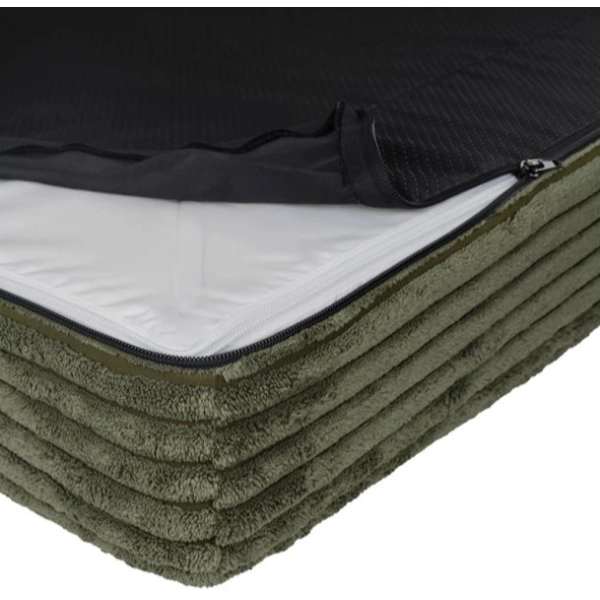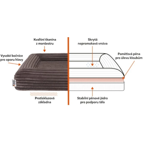 - vodeodolná vnútorná vrstva chráni penové jadro pred vlhkosťou a znečistením – vnútro pelechu zostáva suché a čisté, aj keď pes príde z dažďa