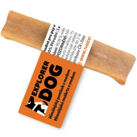 Himalájska maškrta Explorer Dog s medom je zdravá pochúťka plná prírodných bielkovín a širokej škály vitamínov a minerálov. Žuvanie dentálnej syrovej tyčinky s medom vášho psa nielen zabaví, ale pomôže mu aj vyčistiť zuby, odstrániť zubný povlak a znížiť riziko vzniku zubného kameňa. Syr pochádza z mlieka voľne chovaných himalájskych kráv, ktoré sa ďalej starostlivo a dlhodobo spracováva. Hodina varenia, aby sa z mlieka odstránil všetok tuk, 2 - 3 dni lisovania, aby sa odstránila vlhkosť, a potom 20 - 30 dní sušenia v udiarni, aby pochúťka krásne stvrdla a získala jemnú, dymovú chuť. Žuvacia pochúťka Explorer Dog je vhodná pre psy všetkých veľkostí, veku a plemien.