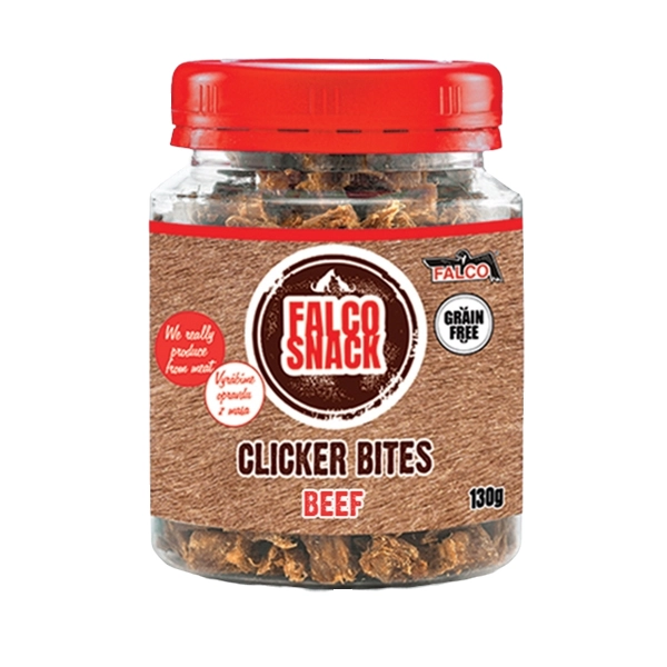 Falco Clicker Bites sú tréningové pochúťky z hovädzieho mäsa vhodné na výcvik vášho domáceho maznáčika. Vďaka ich malej veľkosti môžete odmeňovať častejšie bez toho, aby ste svojho psa prekrmovali. Hovädzie mäso má vysoký obsah esenciálnych aminokyselín, železa a vitamínu B2. Obsahuje tiež bielkoviny, ktoré podporujú rast svalov.