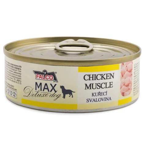 Falco Max Deluxe je superprémiová konzerva plná chudej kuracej svaloviny, ktorá vyniká vysokou kvalitou bielkovín a esenciálnych aminokyselín. Je vhodná pre všetky vekové kategórie a plemená a je skvelá aj pre psov s alergiami alebo citlivým trávením.