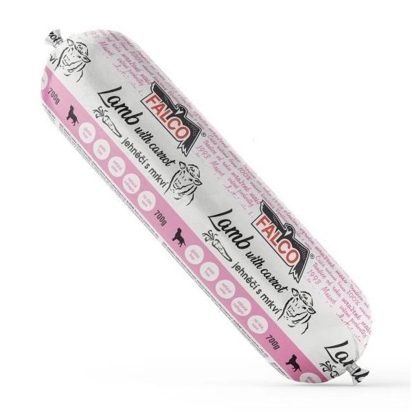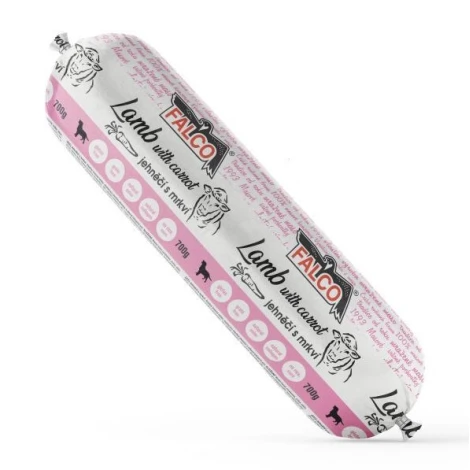 Saláma pre psov jahňacia s mrkvou od českej rodinnej firmy Sokol Falco obsahuje 90 % mäsa, mrkvu s vysokým obsahom vlákniny a vysoký podiel kolagénu. Jahňacia saláma je ľahko stráviteľná a obsahuje kvalitné jahňacie bielkoviny so všetkými esenciálnymi aminokyselinami potrebnými na rozvoj a udržanie svalovej hmoty. Mrkva prispieva k zdravému zraku, správnemu tráveniu a činnosti čriev. Saláma s jahňacím mäsom je vhodná aj pre psov so zníženou funkciou obličiek.