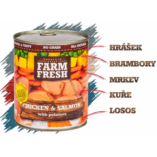 Keď sa v miske stretne kuracie mäso s lososom, zemiakmi, karotkou a hráškom, premení sa bežné kŕmenie na niečo neobyčajné. Čisté zloženie bez obilnín a chémie v konzerve Farm Fresh ponúka poctivú dávku mäsa, najvyššiu kvalitu surovín a optimálnu podporu zdravia a vitality.