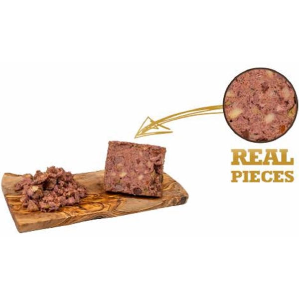Mäso z kurčaťa a lososa a ich vedľajšie produkty živočíšneho pôvodu, brusnice 5 %, mrkva 3 %, hrášok 2 %, minerálne látky 1 %, slnečnicový olej 0,2 %.