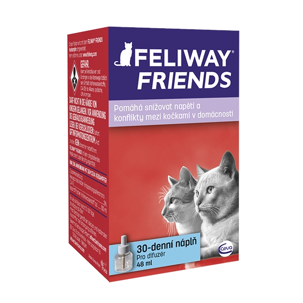 Feliway Friends obsahuje syntetickú napodobeninu feromónu, ktorý sa prirodzene vytvára medzi mačiatkom a jeho matkou a navodzuje pocit bezpečia. Liek je určený na elimináciu konfliktu medzi mačkami. Balenie obsahuje fľaštičku s náplňou do elektrického difuzéru. Elektrický difuzér rozprašuje hormón do priestoru.