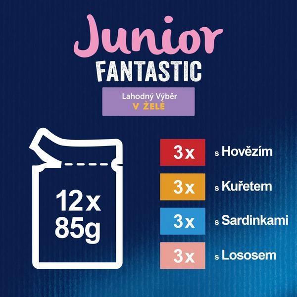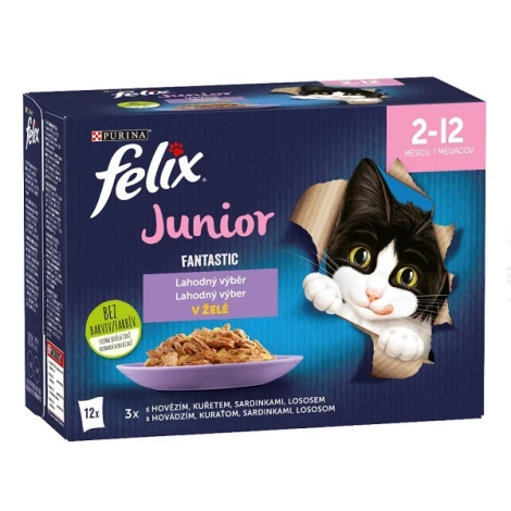 Felix Fantastic Junior Multipack je lahodný výber mäsových receptúr pre mačiatka od 2 mesiacov do roka. Balenie Multipack obsahuje 3 kapsičky s hovädzím mäsom, kuracím mäsom, sardinkami a lososom.