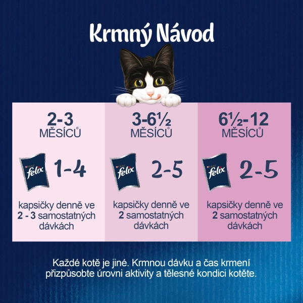 Felix Fantastic Junior Multipack je lahodný výber mäsových receptúr pre mačiatka od 2 mesiacov do 1 roka. Balenie Multipack obsahuje 3 kapsičky 85 g s hovädzím mäsom, kuracím mäsom, sardinkami a lososom. Mäsové kúsky v želé uspokoja náročné chuťové bunky hladných mačiek. Vyrobené bez použitia umelých farbív a konzervačných látok.