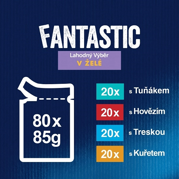 Kompletné krmivo pre dospelé mačky Felix Fantastic. Multipack obsahuje 80 chutných vrecúšok s jemnými kúskami mäsa v želé. Recept je bez pridaných umelých konzervačných látok.