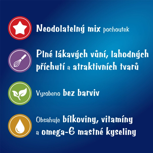 Felix Party Mix Original obsahuje chutnú farebnú zmes pochúťok, ktoré sú plné lákavých vôní, chutí a textúr. Obsahuje maškrty s príchuťou kuracieho mäsa, pečene a morčacieho mäsa.