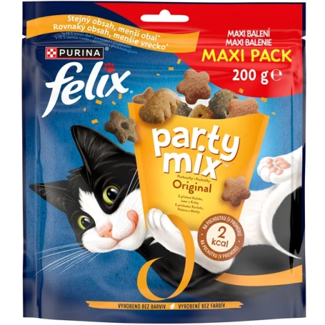Felix Party Original Mix 200 g. Vychutnajte si viac šťastných a roztopašných chvíľ so svojou mačkou s maškrtami Party Mix, ktoré obsahujú neodolateľnú farebnú zmes mäsových pochúťok v rôznych tvaroch, ktoré lákajú vôňou a chuťou. Felix Party Mix obsahuje bielkoviny, vitamíny a omega-6 mastné kyseliny.