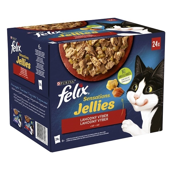 Felix Sensations Jellies Multipack obsahuje niekoľko príchutí, z ktorých si vyberie každá mačka. Ide o chutný výber mäsových receptúr pre dospelé mačky, s jemnými kúskami v rôznych ochutených omáčkach. Súčasťou balenia Multipack je 6 kapsičiek po štyroch príchutiach, ktoré vyzerajú lahodne a lákavo voňajú. Žiadna mačka neodolá.