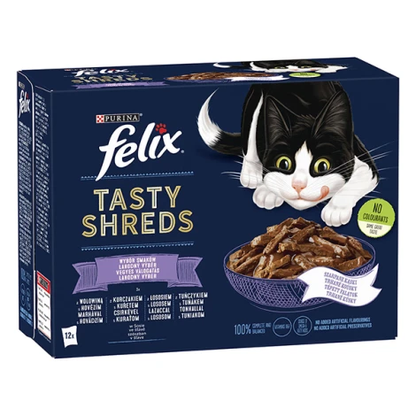Felix Tasty Shreds v balení Multipack s mäsovými a rybacími receptúrami pre dospelé mačky ukrývajú neodolateľné kúsky natrhaného mäsa v šťave. Kúsky hovädzieho mäsa, kuracieho mäsa, lososa alebo tuniaka voňajú a chutia tak lahodne, ako keby ste si ich sami uvarili. Vyrobené bez umelých farbív a konzervačných látok. Sú tiež zdrojom esenciálnych omega-6 mastných kyselín a obsahujú správnu kombináciu vitamínov.
