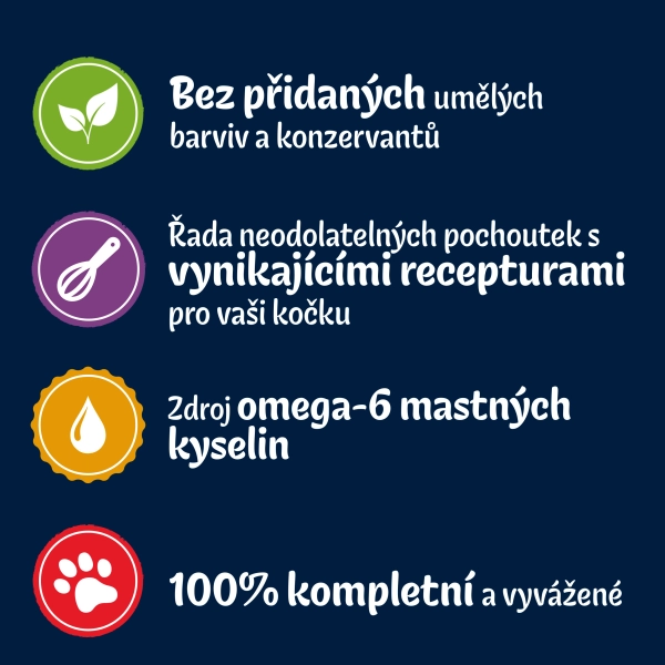 Kapsičky s kuracím: mäso a výrobky živočíšneho pôvodu* (18 %, z toho kuracie mäso 4 %), bielkovinové extrakty rastlinného pôvodu, ryby a vedľajšie výrobky z rýb, cukry, minerálne látky, oleje a tuky, vedľajšie výrobky rastlinného pôvodu.