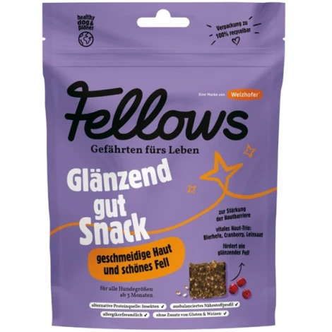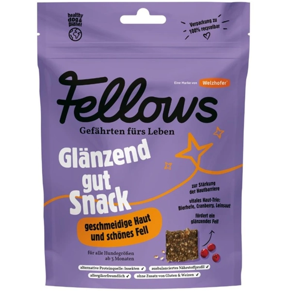 Pochúťky pre psov Fellows Glänzend sú stelesnením bezstarostného chrumkania a zábavy bez svrbenia kože a podráždenia. Ideálne riešenie pre domáce zvieratá s potravinovými alergiami, ktorých príznaky často postihujú kožu. Funkčné pochúťky na výživu srsti a kože sú zdravým a šetrným pamlskom, ktorý sa spolieha na úplne prírodné a udržateľné zložky na čele s hmyzími bielkovinami. Či už ako odmena počas výcviku, alebo ako pochúťka počas dňa.