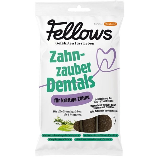 Čisté zuby, svieži dych a spokojné brušká - čarovná receptúra dentálnych tyčiniek hmyzích Fellows pre psov. Hmyzí proteín spojil svoje sily s morskými riasami, eukalyptom a celulózou, aby spoločne odstránili zubný povlak a nepríjemný zápach z papule vášho chlpáčika. Jemne a bezbolestne.
